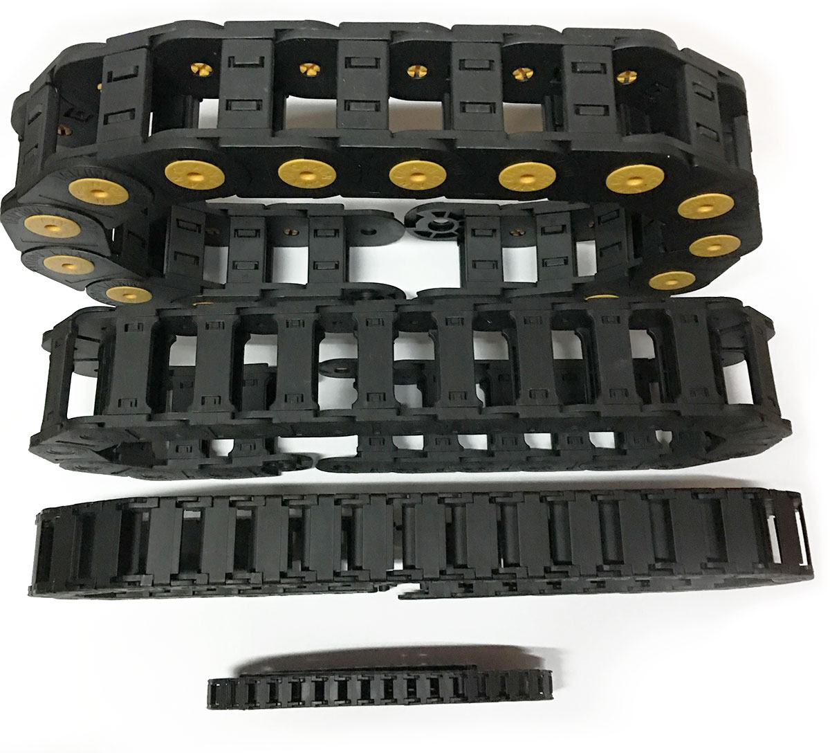 (1)拖鏈外形似坦克鏈,由眾多的單元鏈接組成,鏈接之間轉(zhuǎn)動(dòng)自如。