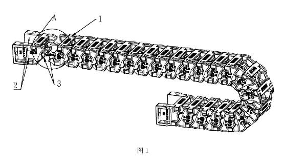 針對現(xiàn)有技術(shù)存在的不足,本實用新型的目的在于提供一種新型的塑料拖鏈,該種拖鏈在任意兩相鄰的鏈節(jié)具有穩(wěn)定的連接的時候,還能夠保證拖鏈整體具有較大的擺動范圍。