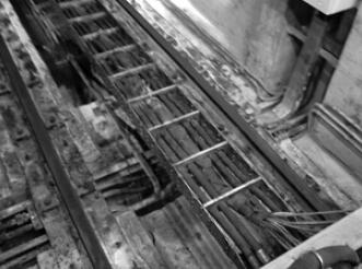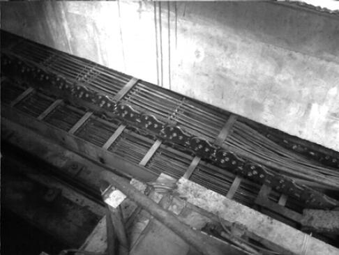 通過(guò)觀察,鋼卷運(yùn)輸車(chē)的拖鏈在運(yùn)行過(guò)程中中間有下垂的現(xiàn)象,這主要是由于鋼卷運(yùn)輸車(chē)的行程較長(zhǎng)。入口鋼卷運(yùn)輸車(chē)的行程為13000mm,出口鋼卷運(yùn)輸車(chē)的行程為14000mm,而在這么長(zhǎng)的行程范圍內(nèi)在設(shè)計(jì)上拖鏈完全沒(méi)有任何支撐。當(dāng)鋼卷運(yùn)輸車(chē)運(yùn)行到遠(yuǎn)端時(shí),拖鏈的中間部分已經(jīng)彎曲變形甚至與地面接觸,而在拖鏈上安裝的液壓軟管和電纜也同樣隨之彎曲甚至與地面摩擦,經(jīng)過(guò)反復(fù)的彎折,拖鏈中的電纜芯容易疲勞斷裂,造成鋼卷運(yùn)輸車(chē)故障不能正常工作。電纜線斷裂故障除了與其在隨拖鏈運(yùn)動(dòng)時(shí)反復(fù)彎折有關(guān)外,電纜線在拖鏈內(nèi)的分布也對(duì)其有很大的影響。拖鏈一般是由單元鏈節(jié)由左右鏈板和上下蓋板組成,拖鏈每節(jié)都能打開(kāi),裝拆方便,不必穿線,打開(kāi)蓋板后即可把電纜、油管、氣管、水管等放入拖鏈。而在拖鏈的內(nèi)部另外可提供分隔片,將鏈內(nèi)空間按需要分隔開(kāi)。鋼卷運(yùn)輸車(chē)的電纜線連同液壓軟管通過(guò)分隔片被固定在拖鏈內(nèi),但是液壓軟管與電纜的分布孔過(guò)于集中,安裝后電纜線比較擁擠,一些較細(xì)的電纜線甚至被卡在分隔片與鏈板間。通過(guò)分析認(rèn)為,電纜線分布集中,被捆扎在一起,而且電纜線隨拖鏈反復(fù)擠壓、彎曲折損,時(shí)間一長(zhǎng)造成電纜線疲勞斷裂。改造前電纜線和液壓軟管在拖鏈內(nèi)的分布如圖1: